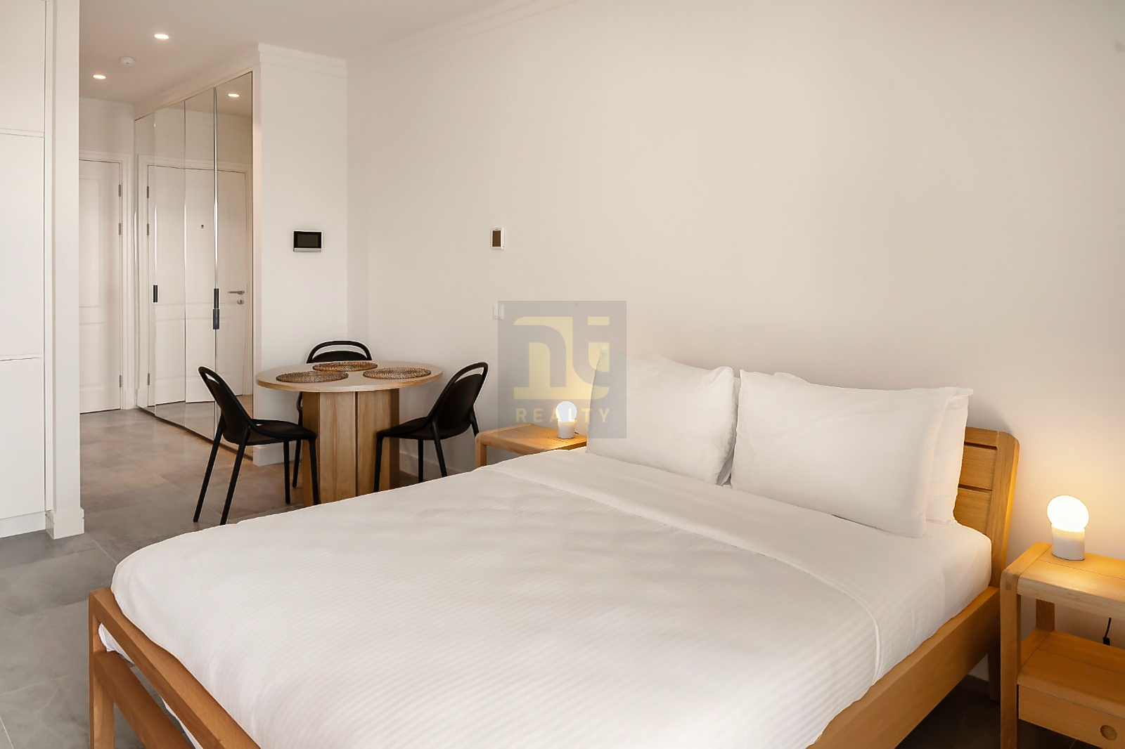 Dieses geräumige Studio-Apartment besteht aus einem Eingangsbereich mit geräumigem Einbauschrank, einer offenen Küche sowie einem Wohn- und Essbereich, der zur großzügigen Terrasse mit Garten- oder teilweisem Meerblick führt.