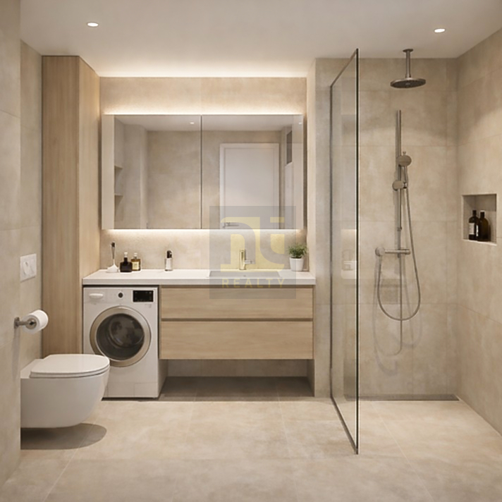 Das Layout ist eher effizient als großzügig. Der offene Wohn-, Ess- und Küchenbereich mit 24,54 m² eignet sich für eine Person oder ein Paar; das Schlafzimmer mit 10,54 m² ist ein echtes Doppelzimmer mit begrenztem Platzangebot; das Badezimmer ist nach dem Ausbaustandard mit ebenerdiger Dusche ausgestattet. Die 4,46 m² große Terrasse ist die größte der drei verfügbaren Standardterrassen im ersten Stock — und von dieser Ebene aus hat man eher einen schönen Blick auf die Bucht als auf dem Dach.