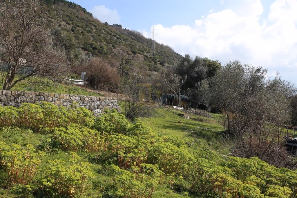 The plot sits slightly above the city, offering open views of the bay and a setting surrounded by greenery and traditional stone terraces typical for this part of the coast.