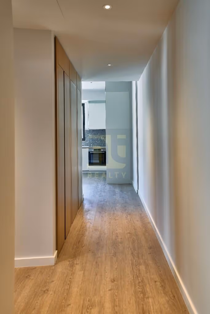 The apartment is on the eighth level — high enough to clear the surrounding roofline and deliver uninterrupted mountain views from the living area and the primary terrace, with partial bay views to the north. The hallway is clean-lined and functional, with full-height oak-finish wardrobe storage running one wall and a wood-effect plank floor that continues through to the main living space.