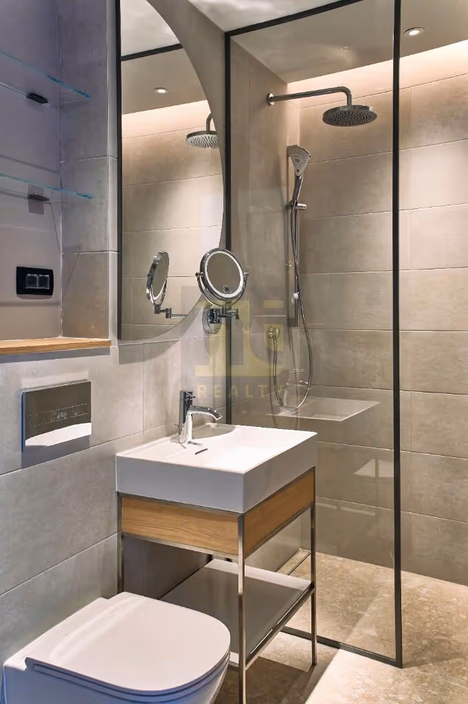 Both bedrooms are set to the quieter interior side of the apartment. They are properly sized for a two-bedroom configuration — not the compressed secondary rooms that often characterise this category — with the same plank flooring, clean white walls, and proportions that read as genuinely liveable rather than specifier-minimum. The bathroom that earns its own mention: large-format grey cement-effect wall tiles, a white freestanding bath with an overhead rain shower and glass screen, an open-frame timber vanity unit, round and rectangular mirrors in combination, and terrazzo floor tiles in pale grey. A wall-mounted WC completes the picture. The detailing — including lit magnifying mirrors and wall-mounted shower controls — is the kind of specification that costs money and reads as such.