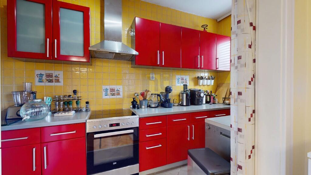 The kitchen is semi-open plan off the living room, fitted in high-gloss red cabinetry with amber tiles — characterful and fully equipped with a ceramic hob, Beko oven, Bosch fridge-freezer, dishwasher, and a window. The extract duct is plumbed for a wood-burning stove, which this house could carry well.
