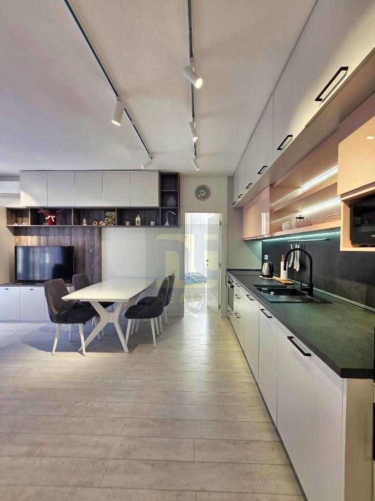 The apartment is 56 m², and the space is used without waste. A custom entrance unit in light ash sets the tone — full-height mirror, coat hooks, shoe bench, storage above and below — and underfloor heating runs throughout from there. Air conditioning in every principal room; key card entry. The living space is open plan, with the kitchen across one full wall: dove grey floor-to-ceiling cabinetry, blush pink high-gloss mid-level units, a black worktop and black sink. Fully integrated — oven, hob, fridge-freezer, washer-dryer, dishwasher, microwave — and finished with adjustable track lighting that covers the whole room. The dining area and corner sofa sit opposite, the sofa opening to a guest bed when needed. A floor-to-ceiling sliding door opens west onto the balcony, where the Vrmac ridge fills the view and the afternoon sun comes in.