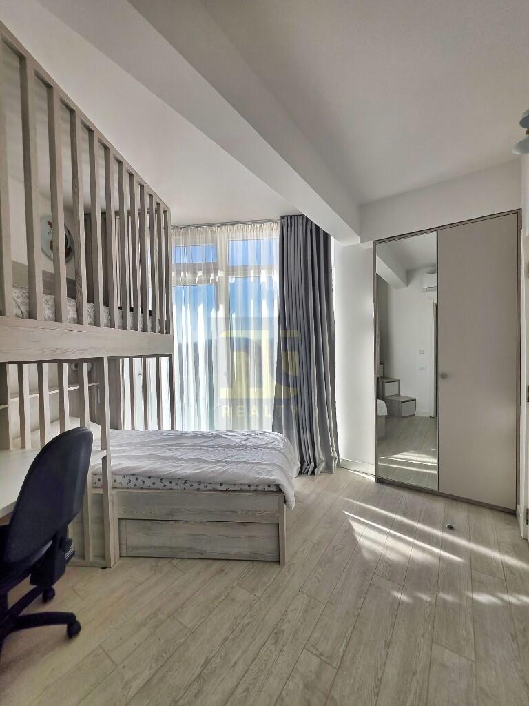 The second bedroom currently sleeps two — a lower single and an upper bunk in a custom built light ash unit, with an integrated desk, shelving, and a laptop socket. A floor-to-ceiling sliding door faces southeast, catching the morning sun, with a partial sea view over the rooftops below. The second bathroom has a full bath with handheld shower, wall-hung WC, floating vanity, illuminated mirror cabinet, and heated towel rail.