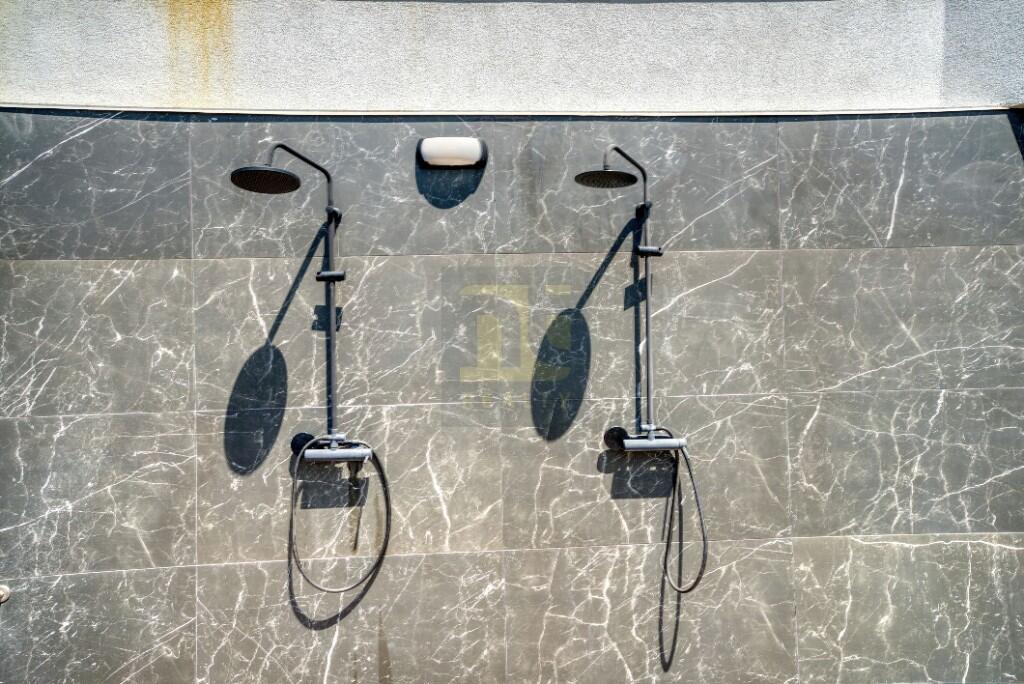 The communal facilities occupy the lower levels of the building. The pool sits on a southwest-facing ceramic sun deck that gets the late sun and faces the sunset; alongside it a jacuzzi and an outdoor shower. The sauna is timber-lined with a picture window looking over the pool and out to the bay — the position is as good as the description suggests. Below that, a residents' lounge with sofas, a kitchenette, and a TV; changing rooms for men and women; a walk-in shower with calacatta-effect feature tiling; and a WC at pool level. Underground parking space one — the most accessible in the building — comes with an adjacent lockable storage unit. One thing to see clearly before committing: there is active construction on the adjacent plot, currently visible from the pool terrace. Note it, allow for it in any rental timeline, and view before deciding.