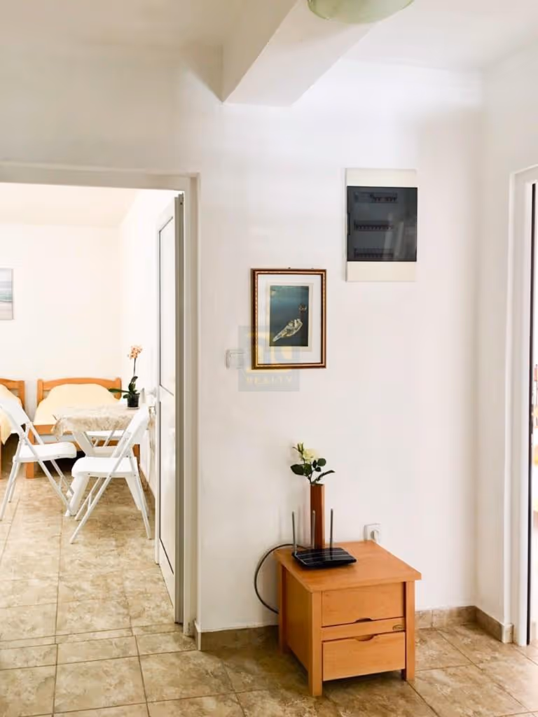 It stands on a 476 m² land plot, and its total area is 302 m². It has a garden with citrus trees and parking spaces for 9 cars. The distance from the beach is 120 m, and there are also bars and restaurants within walking distance. On the ground floor, there is a large living room, kitchen, office, two bedrooms, a bathroom, and three terraces. On the second and third floors, there is one apartment with a terrace and three rooms with balconies, all with shower rooms and toilets.