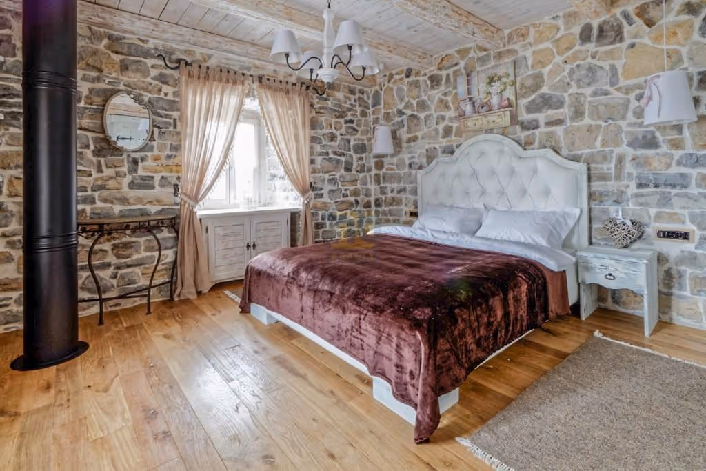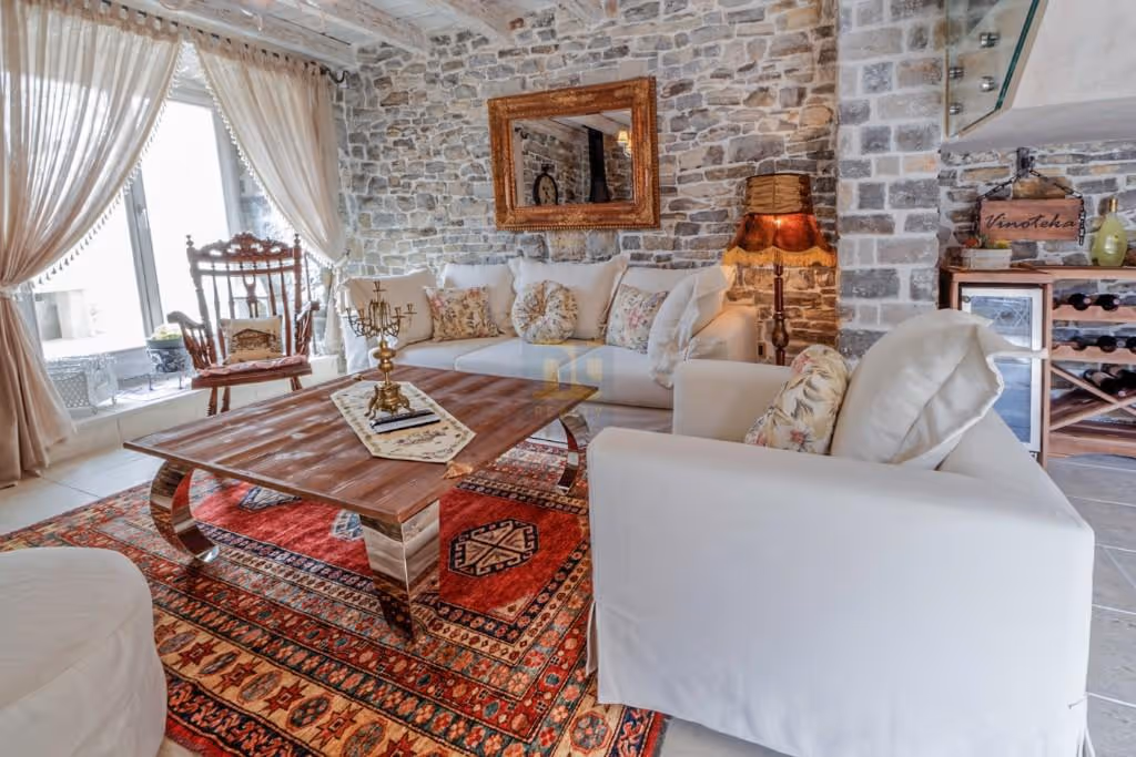 The villa measures 125 m² and includes 3 bedrooms, 2 bathrooms, and a toilet room. The rooms are spacious and bright, equipped with modern furniture and offering sea views. All accommodation units are built with modern materials and feature a rustic combination of wood and stone, providing a warm and inviting atmosphere.