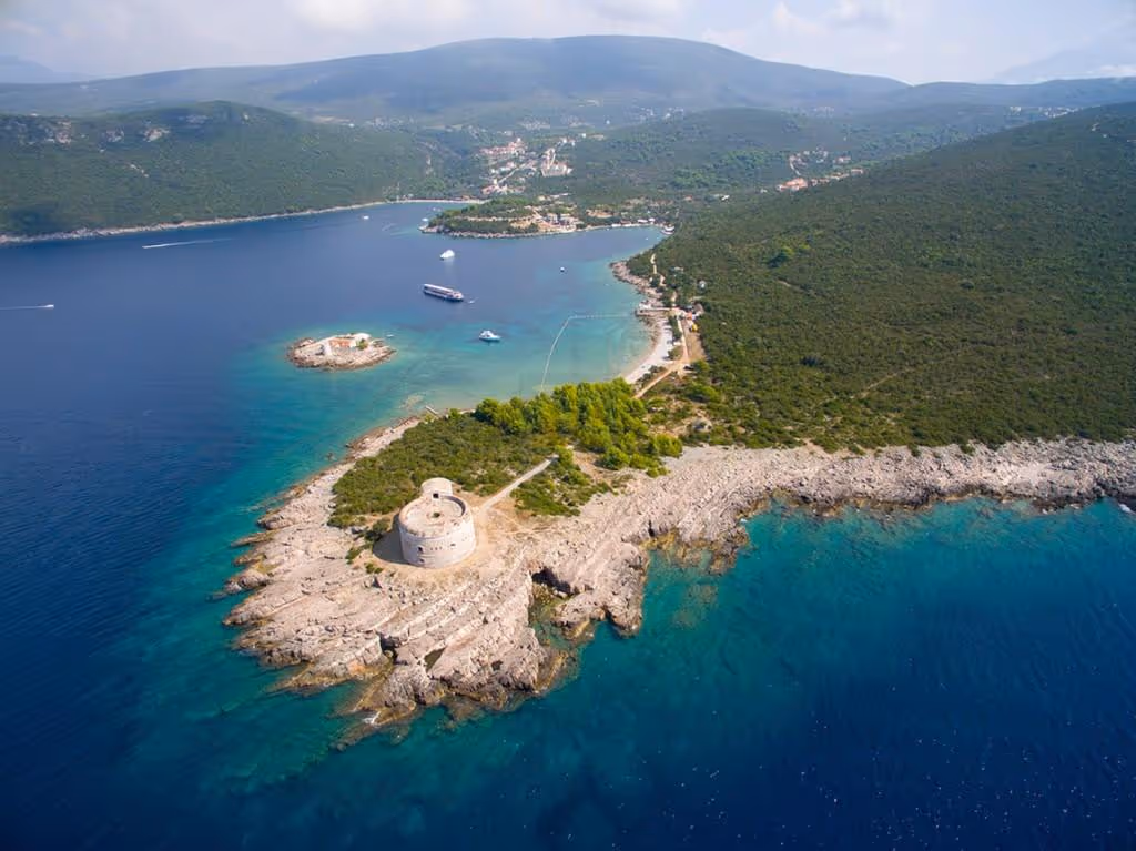 Over a century ago, Montenegrin defenders erected fortresses on islands and rocky points at the mouth of the Bay of Kotorska to protect it from enemy forces in the Adriatic Sea. At the eastern point on the Lustica Peninsula, the historic ruins of the old Bastion are all that remain of the old embattlements. The Arza Cape Resort is located at this natural confluence of turbulence and tranquillity, where historic battles took place in the most picturesque of natural settings. This prominent 11-hectare point is encircled by the stunning beauty of the bay and ocean coastlines and set against the backdrop of a steeply sloping hillside and the dramatic mountains beyond.