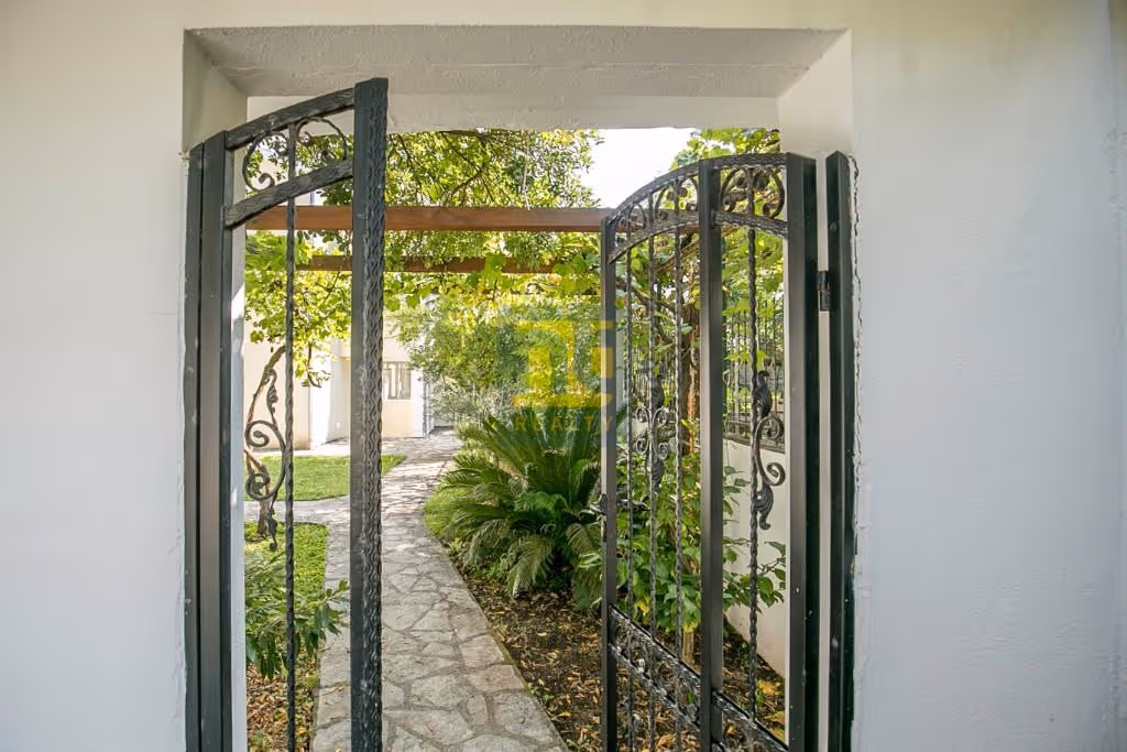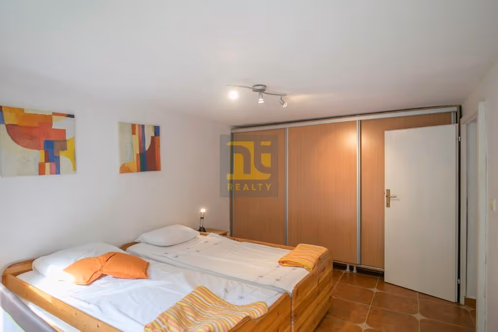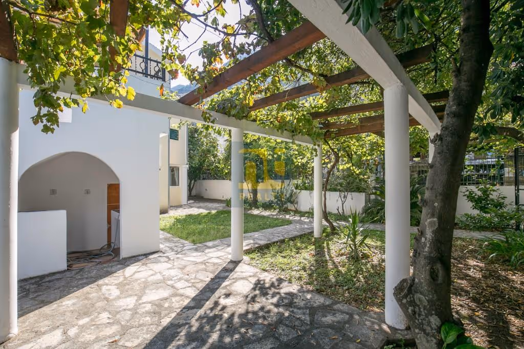 When you enter the plot, you are greeted by a private garden decorated with grapevines. On the ground floor of the house, there are three bedrooms and two bathrooms, providing enough space to accommodate your whole family. The first floor is reserved for the living room, dining room, and a small but equipped kitchen. From the living room, you enter a partially covered terrace of 16m2. The attic is turned into a gallery space with one more, smaller and more intimate terrace.