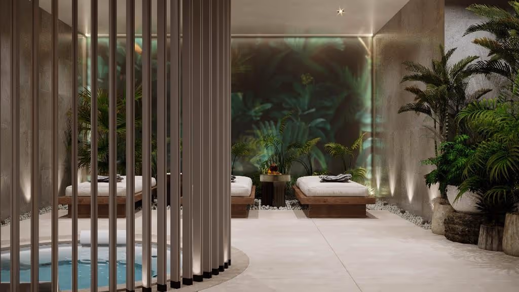 The complex will consist of two detached buildings. Each building is equipped with a seating area and a rooftop pool.