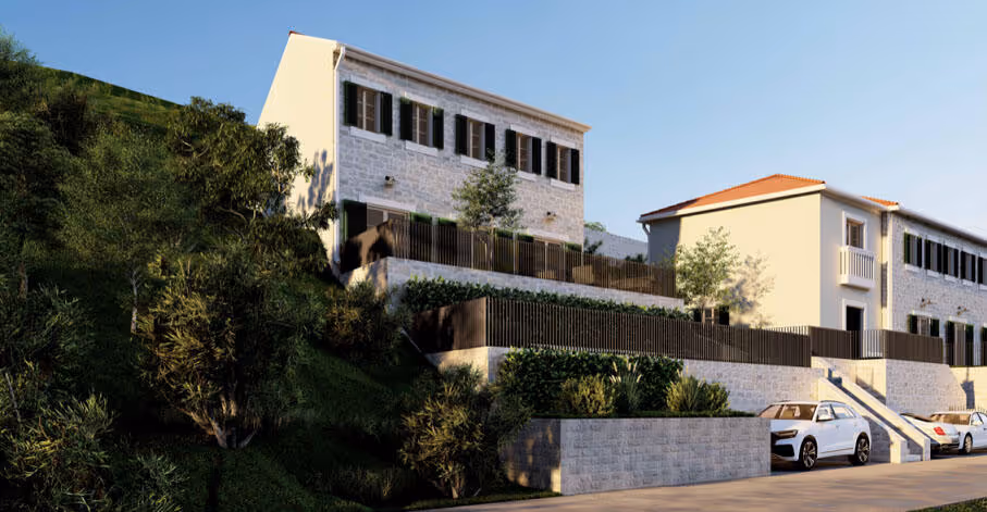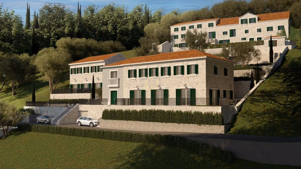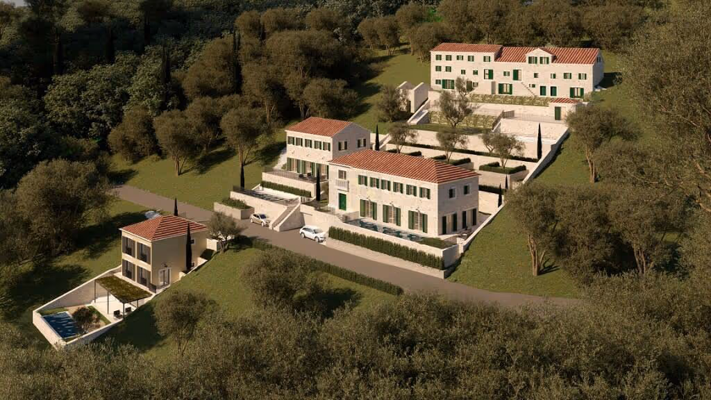 The project is for a residential complex of four private villas, each surrounded by its garden. The design makes the most of the steep terrain to give each property uninterrupted, panoramic views over Tivat Bay.