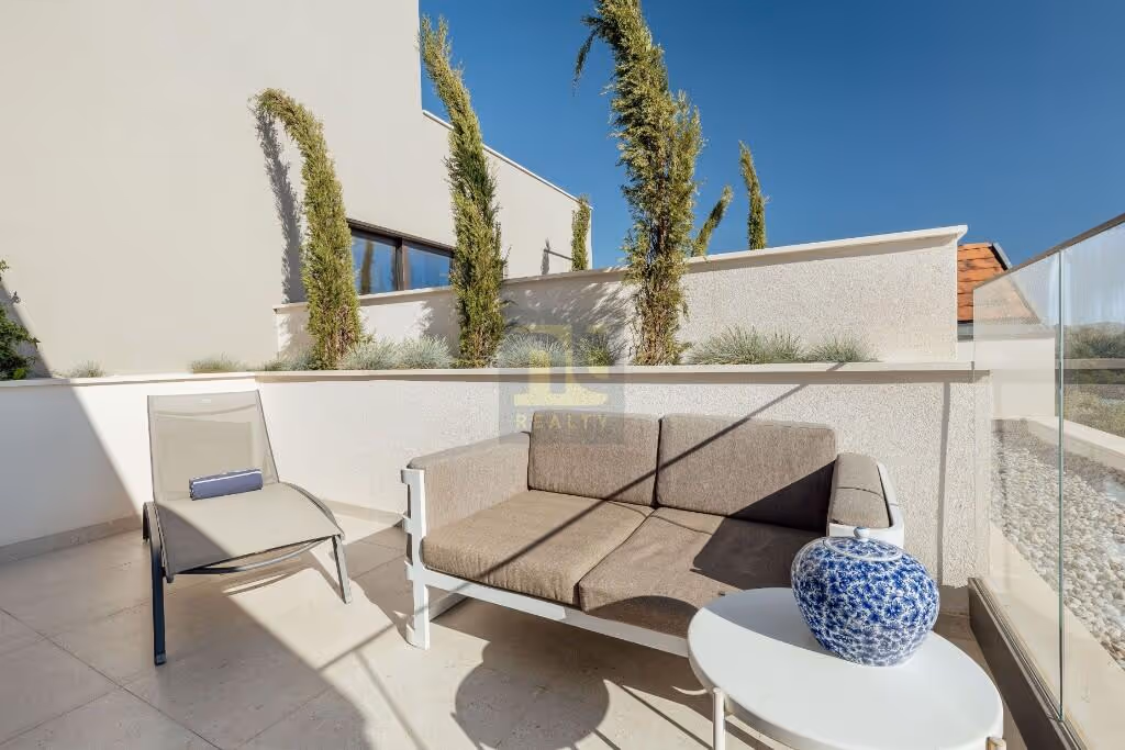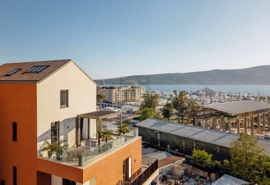 We are delighted to present a truly exceptional luxury penthouse apartment featuring magnificent 180-degree sea views across the Porto Montenegro marina. Situated within the prestigious Thea building at Boka Place in Tivat, this duplex residence spans the 6th and 7th floors. Offering a generous total area of 179 square meters (108 square meters of internal space and a substantial 71 square meter terrace), the penthouse features two en-suite bedrooms, a spacious living room with dedicated dining area and a well-appointed kitchen, two elegant bathrooms, and a delightful terrace perfect for enjoying the captivating sea vistas.