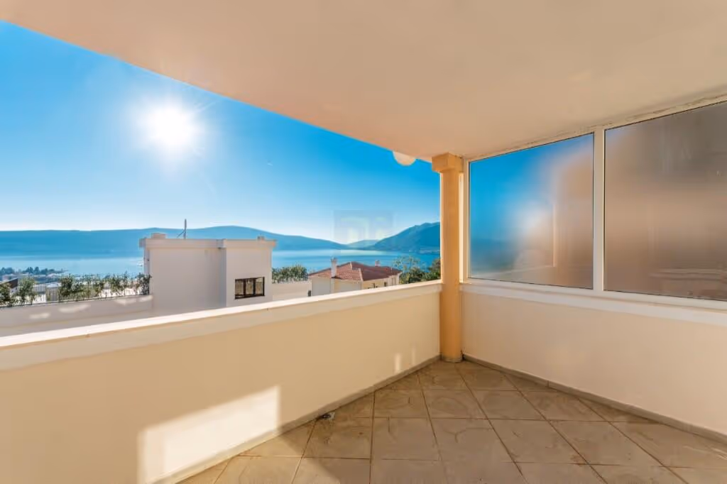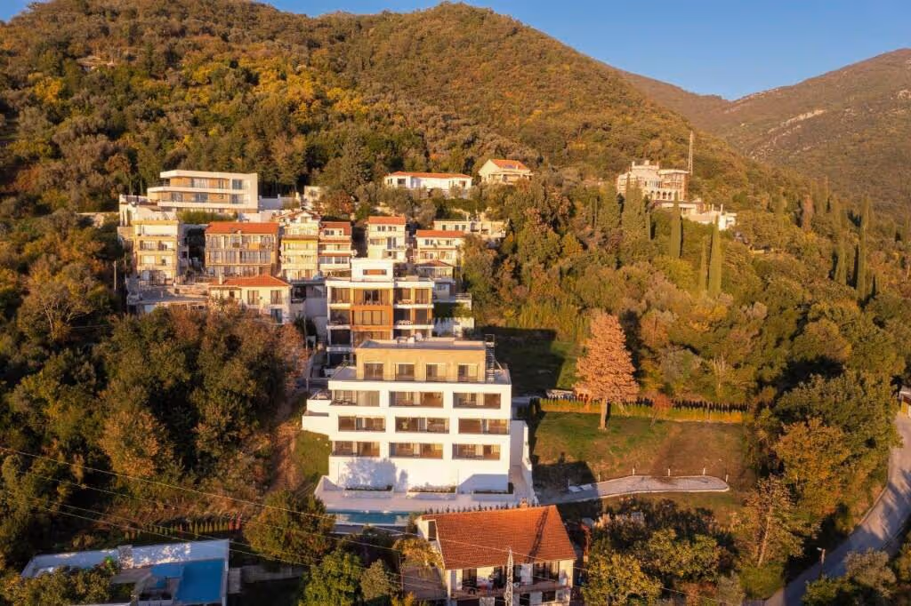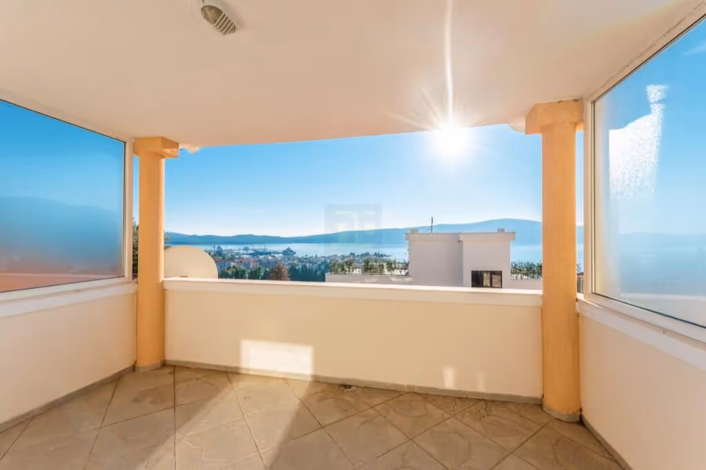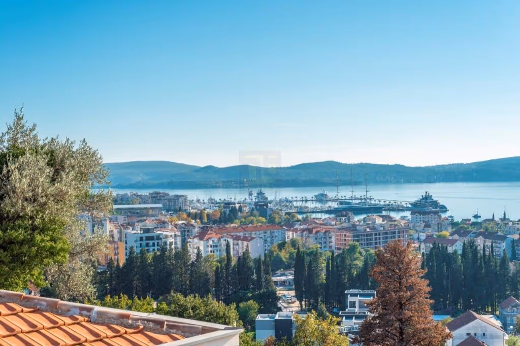 Its elevated position provides open and far-reaching views across Tivat Bay while maintaining a quiet residential setting, approximately a ten-minute walk from the coastline.