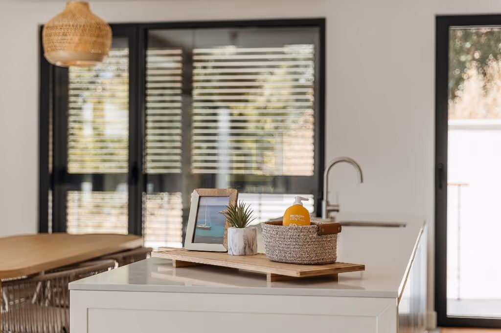 The house has five bedrooms, each with its own bathroom, giving every guest privacy and comfort. On the ground floor, the open-plan kitchen and living space is bright and airy thanks to large windows that bring in plenty of natural light and open the rooms up to the terraces outside. With air conditioning throughout and a well-equipped kitchen, the villa is comfortable in every season.
