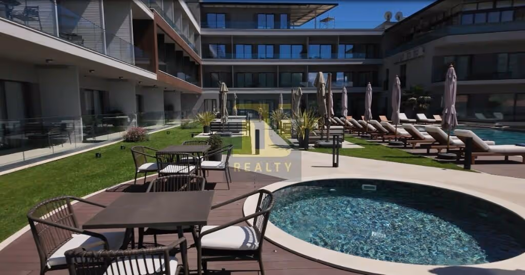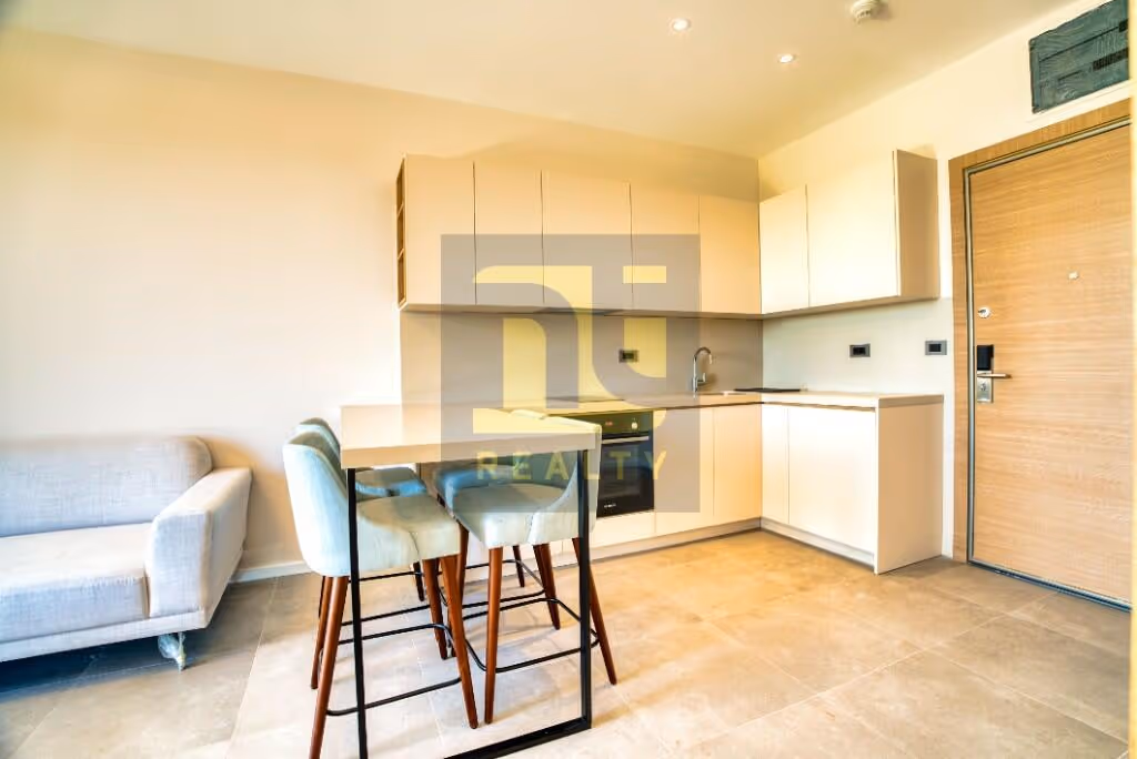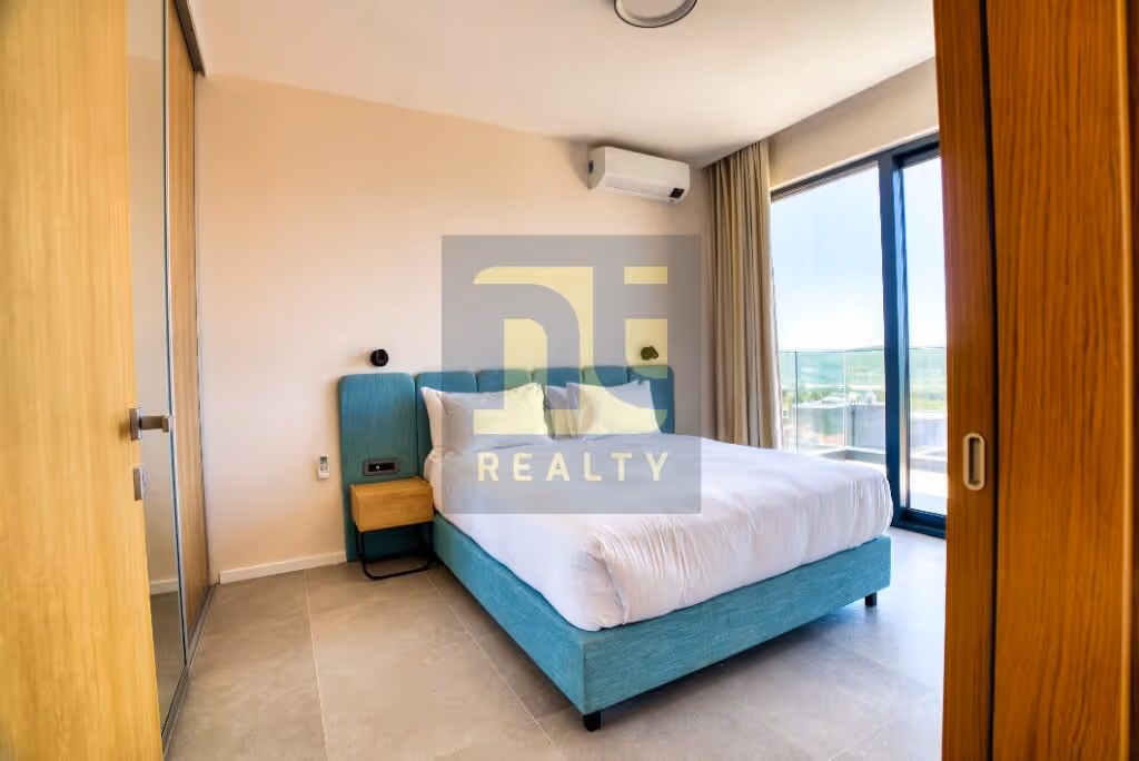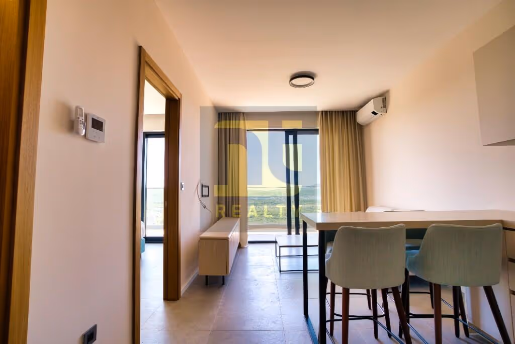 This is a spacious one-bedroom apartment with generous-sized rooms and high ceilings. The total internal area is 47 m² and consists of an open-plan living, kitchen, and dining room, one cozy bedroom, and a bathroom finished with marble-design porcelain tiles, a tempered glass shower cabin, a vanity unit, and fitted cabinets. The bedroom, like the rest of the property, is furnished with upmarket furniture and fitted cupboards providing roomy storage. Both the living room and bedroom have direct access to a terrace offering astonishing views.