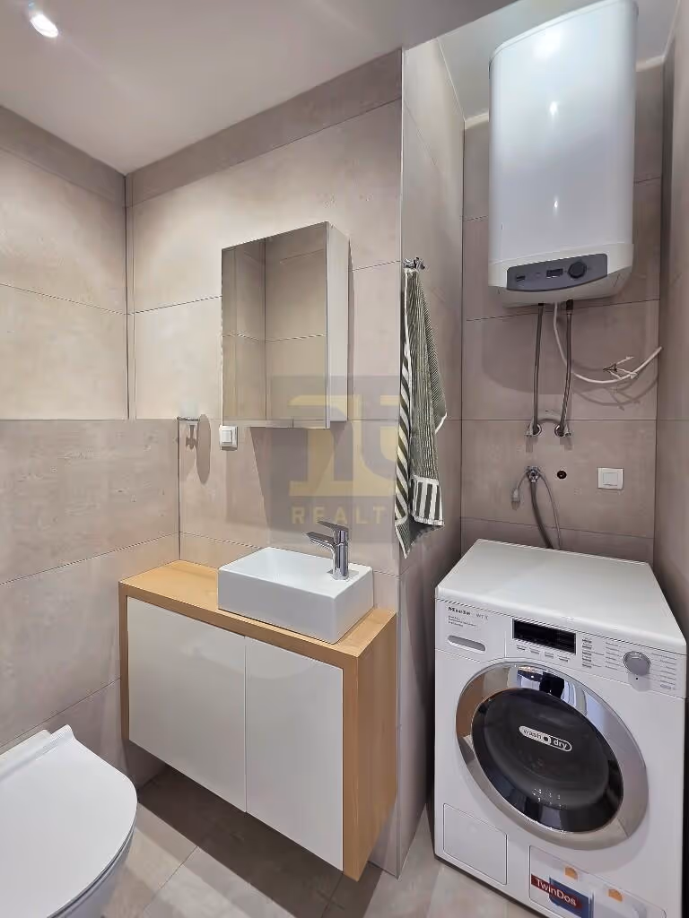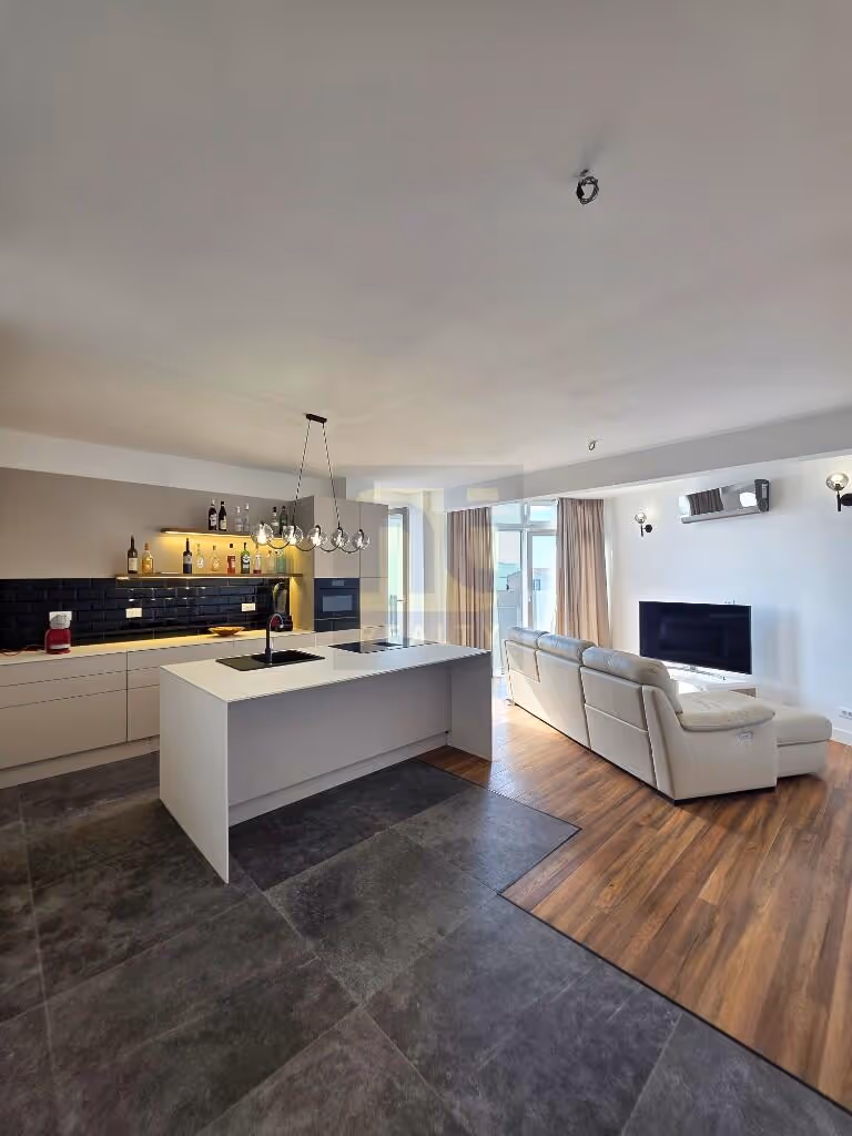 A spacious 14 m² terrace with amazing views is accessed from the living room. The apartment also includes a guest toilet. All finishing materials were carefully selected by an interior designer.