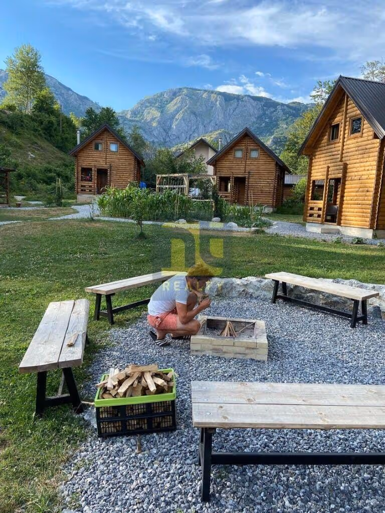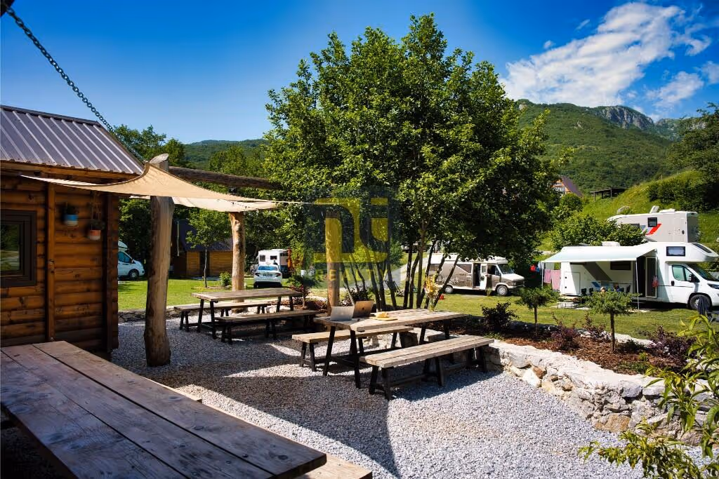 The property includes 9 structures: 4 spacious cabins (50 m² each), 2 smaller cabins (25 m²), a 15 m² storage unit, an outdoor bar, a toilet area with 2 toilets and 2 showers, and a 14 m² greenhouse. All furniture in the cabins is included in the sale price. Currently operating as a tourist business, the property features rental cabins and a campground with 12 allocated plots, each equipped with electricity. Accommodation capacity supports up to 20 people in the cabins and up to 30 people (or 15 cars) in the campground.