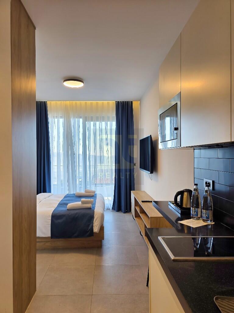 For sale a beautifully designed 23 m² studio apartment on the first floor of the prestigious Royal Blue Aparthotel in Kavac.